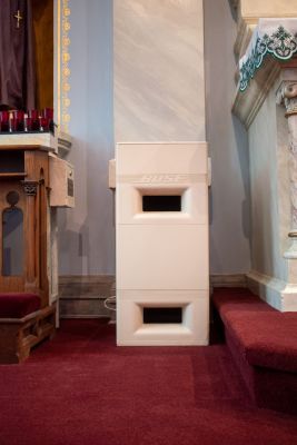 - Bose professional low-profile ceiling mounted speakers extend sound to the choir loft.